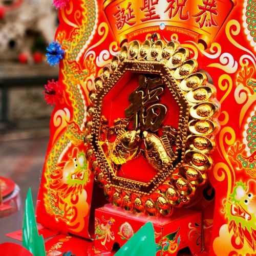 以壽麵、壽桃疊成的「壽桃塔」一對來供獻,在兩座塔旁邊分別掛上紅賀條兩幅,右畫神名、左寫信徒姓名,除了有祝賀神明生日之意,也有為家中添福添壽作用。萬毅「壽桃塔」就是盤桃匯集成塔的意思